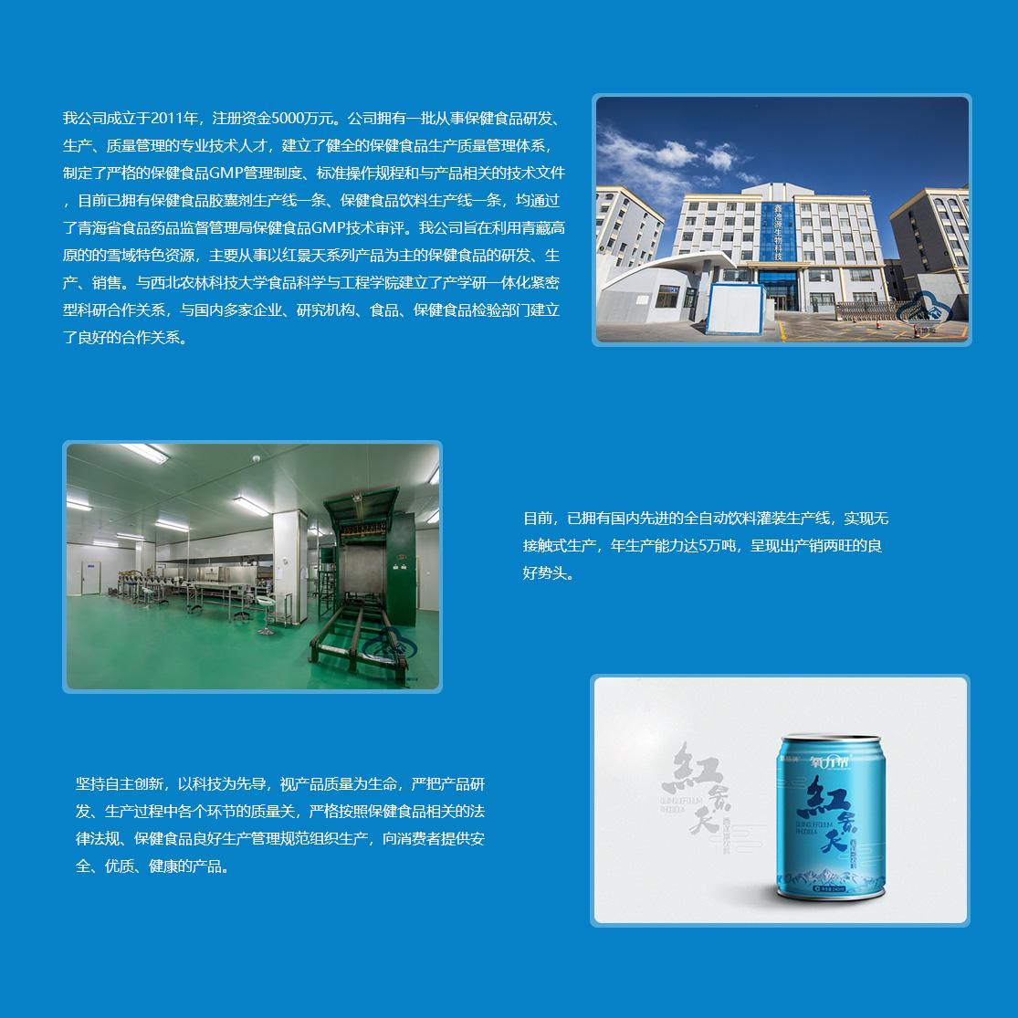 青海鑫池源生物科技開發(fā)有限公司2011年3月29日在青海生物科技產(chǎn)業(yè)園區(qū)工商行政管理分局登記成立,注冊資金5000萬元。         鑫池源公司立足于青海省綠色環(huán)保無污染的高品質紅景天資源,以西北農(nóng)林科技大學食品科學與工程學院和青海格拉丹東藥業(yè)有限公司為技術依托,主要從事紅景天、紅枸杞、黑枸杞等高原生態(tài)植物資源的研究開發(fā)和深加工,產(chǎn)品包括“景胨”牌紅景天西洋參保健飲品、紅景天口服液、紅景天膠囊等系列產(chǎn)品。         公司擁有一批從事保健食品研發(fā)、生產(chǎn)、質量管理的專業(yè)技術人才,建立了健全的保健食品生產(chǎn)質量管理體系,制定了嚴格的保健食品GMP管理制度、標準操作規(guī)程和與產(chǎn)品相關的技術文件,目前已擁有保健食品膠囊劑生...